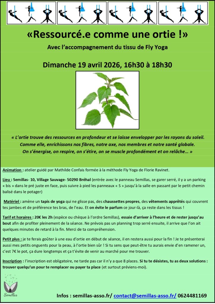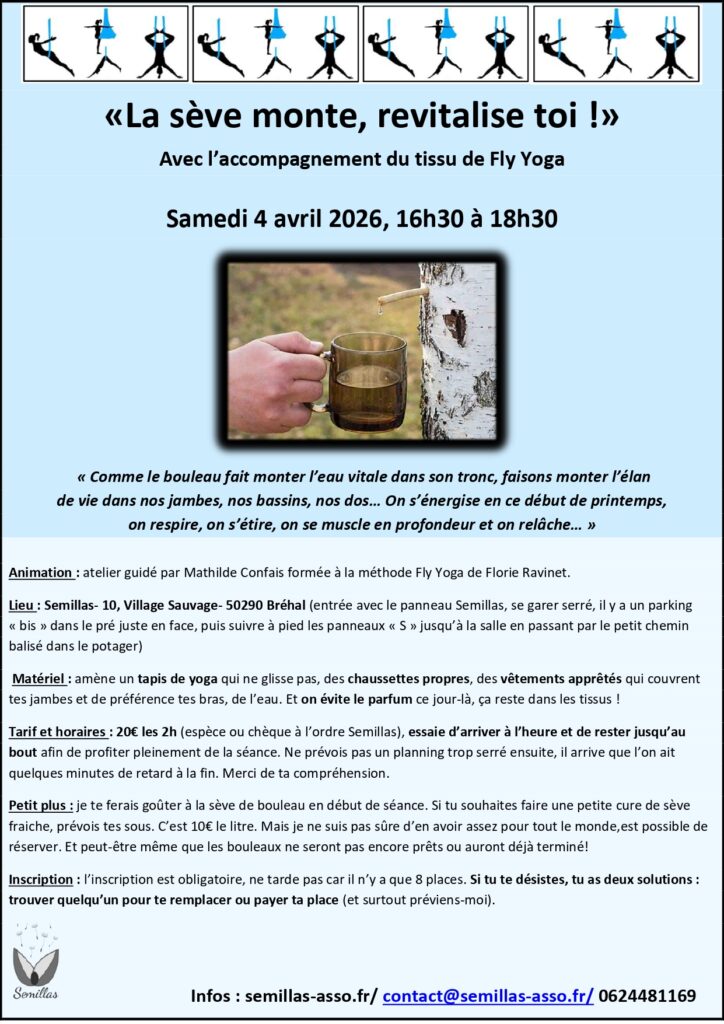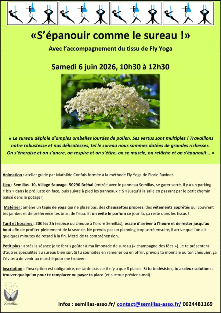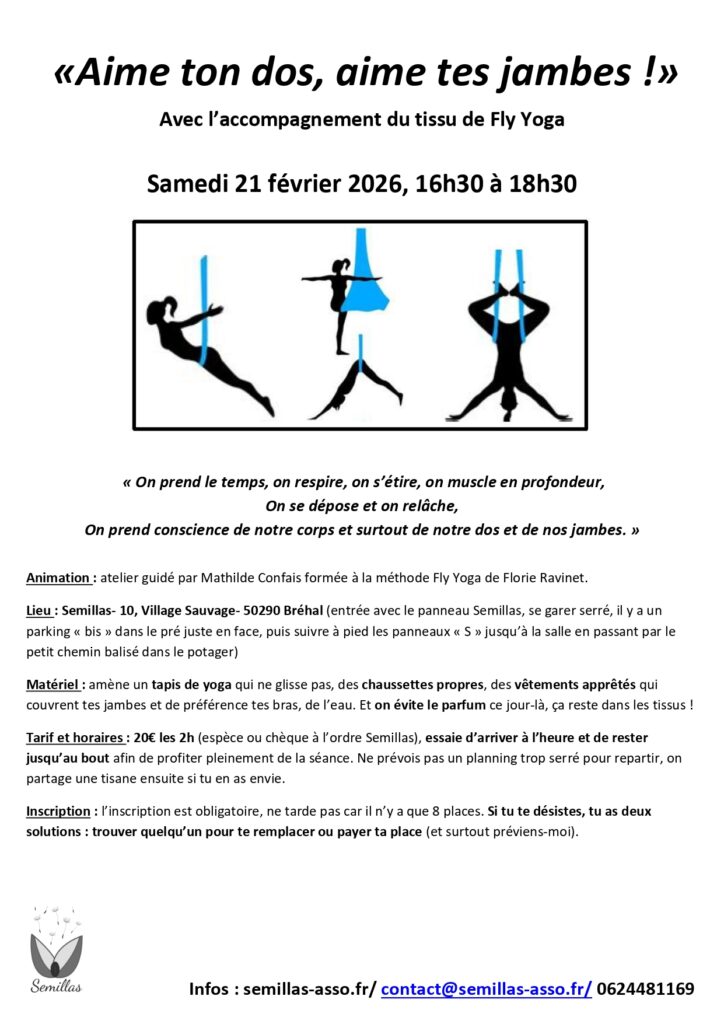 Fly yoga inscription annuelle: nous pratiquons les vendredis tous les 15 jours dans une belle salle fraichement rénovée au 10 village sauvage à Bréhal. Niveau débutant, 1h de cours, 180€ l’année pour 18 séances.  Toutes les dates sont sur l’agenda du site.
