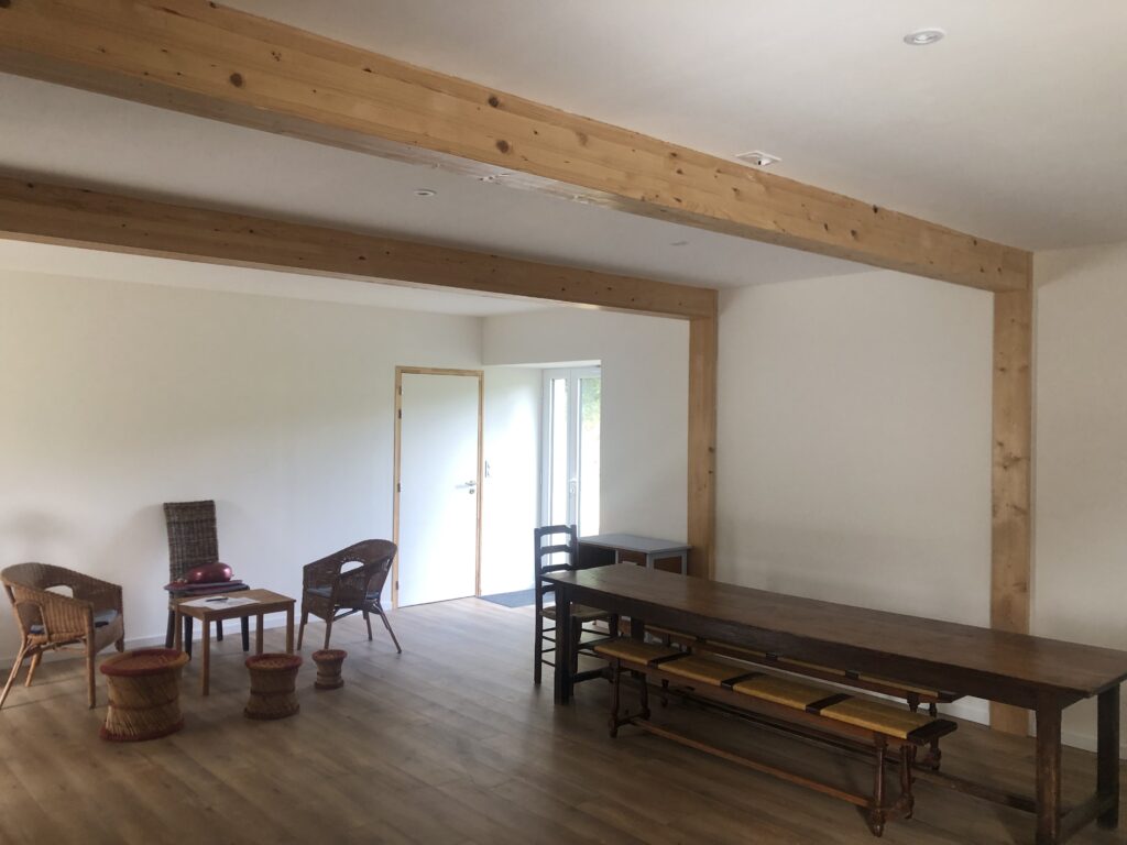 Grande salle de pratique: située à l’étage au dessus de la salle d’accueil, 85 m² sous toit cathédrale. Parquet au sol, murs terre-chaux-chanvre et pierres jointées. 3 grands chauffages permettent de chauffer le lieu si besoin.